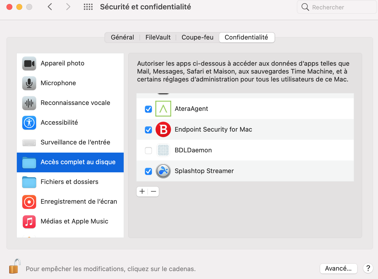 E/ Donnez les autorisations nécessaires en cliquant sur les différents items dans la partie de gauche puis en cochant comme sur la capture Splashtop Streamer et Atera Agent (uniquement présent dans "Accès complet au disque")