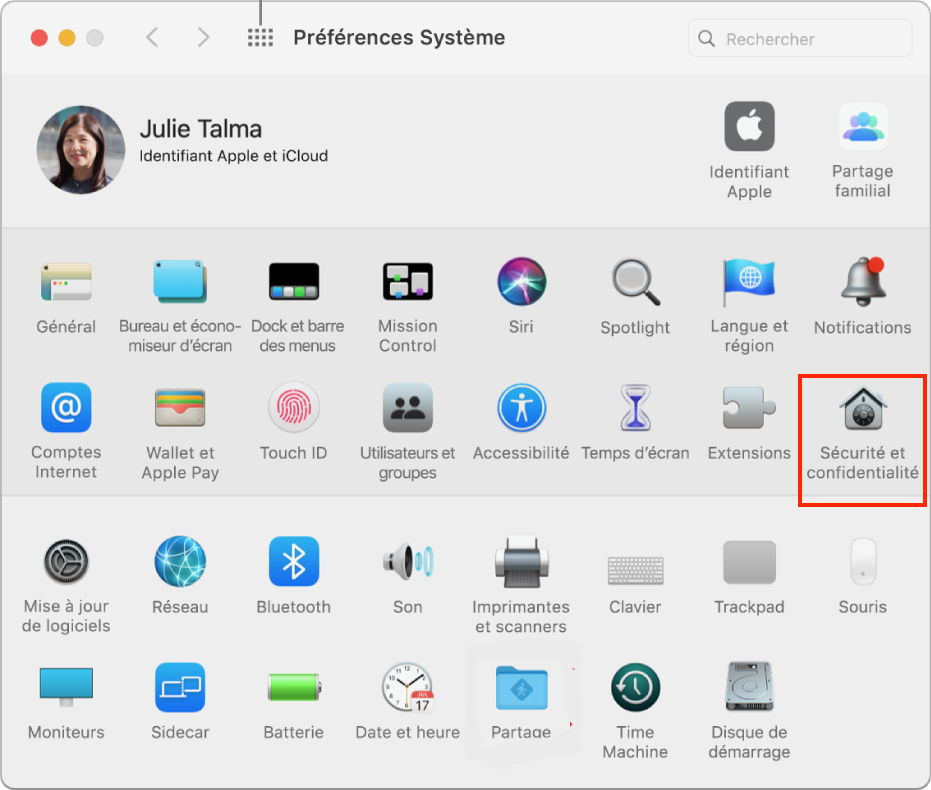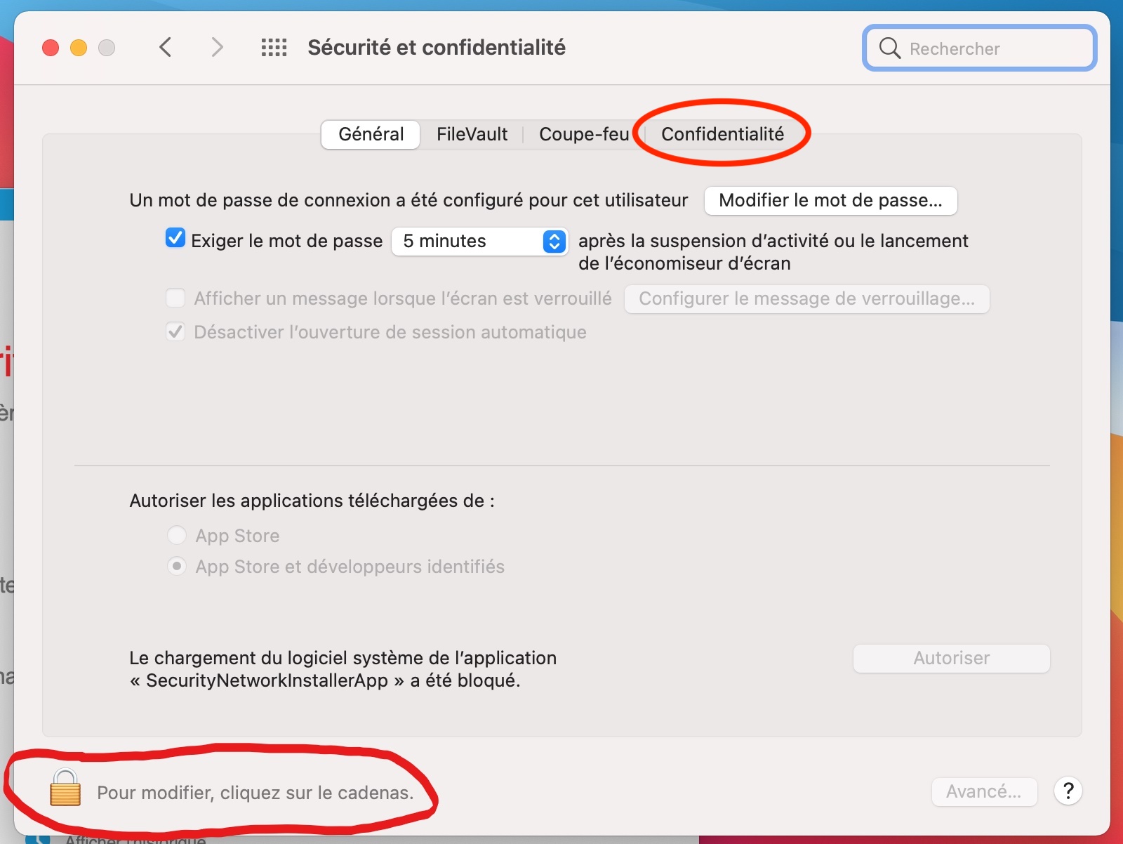 D/ Cliquez sur l'onglet "confidentialité" puis sur le cadenas en bas à gauche de la fenêtre (le mot de passe de l'ordinateur est demandé)